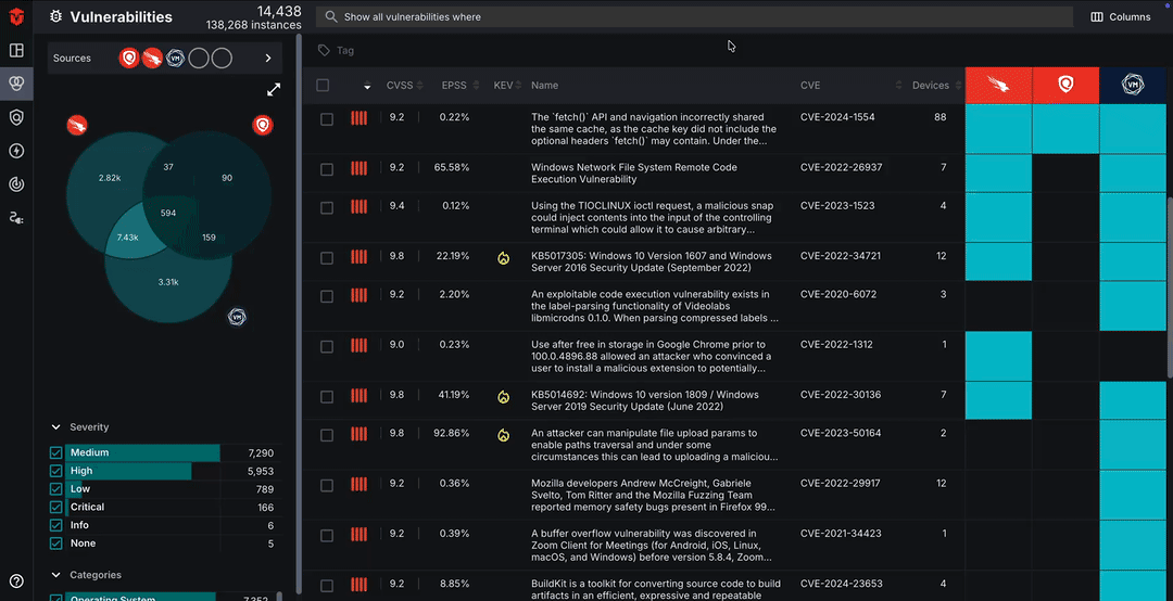 OS Platform | The operating system platform associated with a Device asset impacted by a software Vulnerability | OS Platform equals Windows |